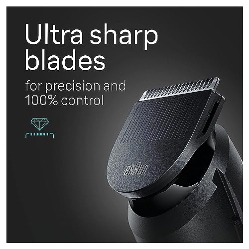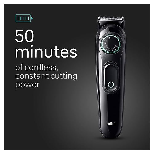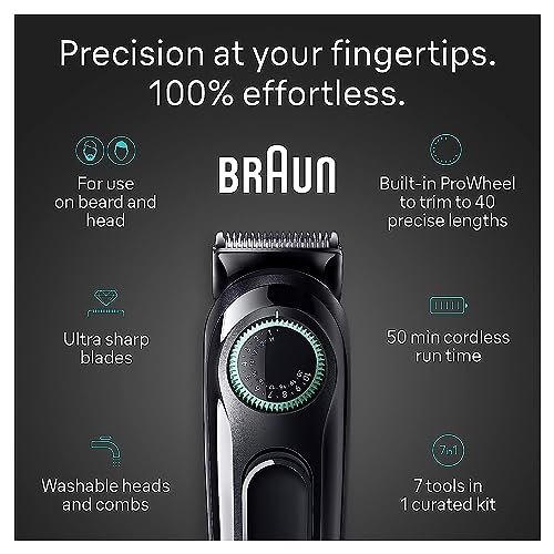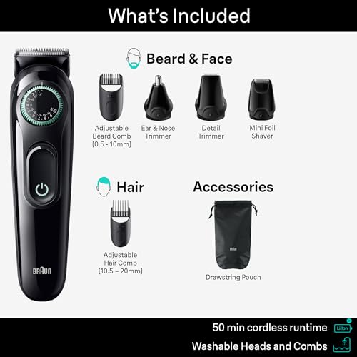 Experience versatile and precise head-to-toe grooming from home with the Braun Series 3 7-in-1 Grooming Kit. This all-in-one grooming kit for men includes a hair trimmer device with a variety of attachments to tailor to your grooming needs; whether you need a beard shaver, beard trimmer, hair trimmer or ear and nose hair trimmer. The adjustable Precision Wheel on these hair and beard trimmers for men features 40 length settings in 0.02-inch (0.5 mm) steps to cut your hair to the precise length you need. Ultra-sharp blades on these hair trimmers make shaving fast and efficient while allowing for the ultimate precision and control. With a powerful NiMH battery, you get 50 minutes of cordless cutting power. Plus, the washable head and combs let you easily clean and maintain these cordless hair clippers for men. This grooming and shaving kit also comes with a drawstring pouch for convenient storage and transportation.