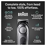 Braun Series 7 All-In-One Style Kit. For versatility and precision at home. With a beard, ear & nose trimmer, hair clippers and body groomer. Features the Precision Wheel with 40 length settings and our sharpest ProBlade. 100-minute cordless runtime. Includes: ProBladetrimmer head, fine pitch head, precision beard (0.5 mm – 10 mm) & hair (10.5 – 20 mm) combs, beard fading combs, ear & nose trimmer head, detail trimmer head, mini foil shaver, charging stand, beard stencil, organizer case. Box Content 1x Trimmer device incl. ProBlade trimmer head 1x Body groomer head 1x Precision beard comb (0.5 mm – 10 mm) 1x Precision hair comb (10.5 – 20 mm) 1x Beard fading combs 1x Ear & nose trimmer head 1x Detail trimmer head 1x Mini foil shaver 1x Cleaning brush 1x Charging stand 1x Beard stencil 1x Organizer case
