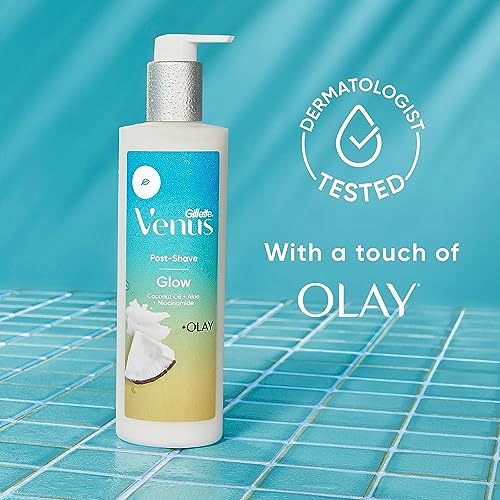 Pamper your skin with Venus Glow Post-Shave Oil-Infused Moisturizer for women. You’ll get soothing 24 hour hydration for smooth, glowing skin. Made to moisturize skin after shaving, this body lotion can also be used daily between shaves to help maintain healthy looking skin. Whatever you shave… legs, armpits, or anywhere else head to toe our oil-infused lotion gets you moisturized and glowing afterwards. This specially designed formula is made with skin-loving, sea-inspired ingredients. With coconut oil, aloe, niacinamide, and even a touch of Olay, all made without parabens, dyes, or SLS sulfates. Dermatologist tested, this moisture lotion oil is full of humectants and rich emollients for long-lasting moisture. Sticky residue? Not from this body cream. Its dreamy formula absorbs into your skin for a lasting feeling of moisture. Let your senses escape to the sea with the Venus shave routine trio: Prep your skin with the smoothing Venus Sea Salt Exfoliant, lather with the moisturizing Venus Shave Cream, and get that post-shower glow with Venus Post-Shave Oil Infused Moisturizer. It’ll make your entire shave experience a breeze.