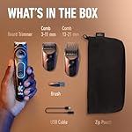 INCLUDES: Cordless Beard Trimmer, short beard comb, long beard comb, stubble comb, charger and cleaning brush
